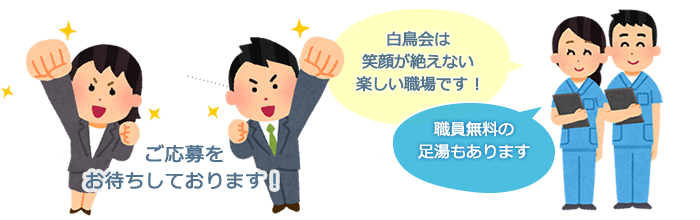 「特別養護老人ホーム あおやま」では、「職員を大切にしたい」という『社会福祉法人 白鳥会』の “労使相互信頼” の法人理念を基に、職員には働きやすい環境を整えるべく努めております。 研修制度の充実はもちろん、資格取得に対するサポートも充実。女性が長く勤められるように、 同法人保育園の保育料の一部負担も行っております。さらに、社内規定による人事考課制度を採用し、 年2回の賞与(3~4ヶ月分)を人事考課により、能力・頑張り、事業実績に応じて支給します。